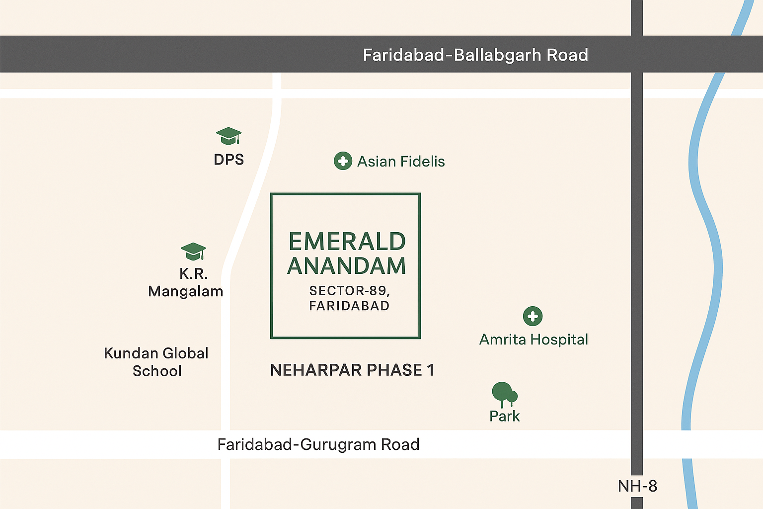 Emerald Anandam Faridabad is a premium residential project strategically located in Sector 89, Faridabad, within the well-planned Greater Faridabad real estate residential market. Designed for modern families seeking space, comfort, and connectivity, the project features spacious 3bhk & 4 BHK apartments.